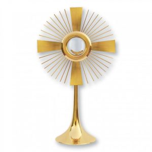 Modern monstrance in gilded brass, glossy satin finish. Height 66 cm for magna host, diameter 16 cm.