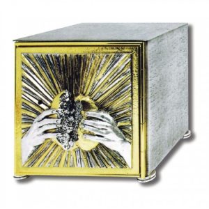 Wall tabernacle, in gilded and silvered cast bronze, with two-tone sunburst, small door decorated with chalice, host, grapes and wheat, fixed or with display for the SS. Sacramento, door size 30×30 cm, sunburst 67×67 cm.